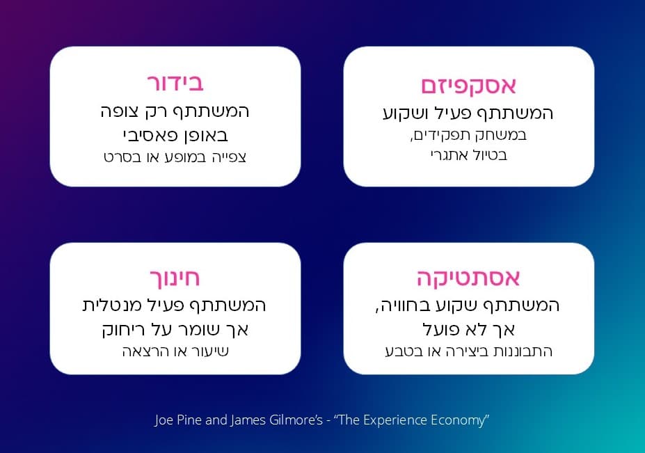 - רמת המעורבות של המשתתף – האם הוא משתתף באופן פעיל או פסיבי בחוויה.